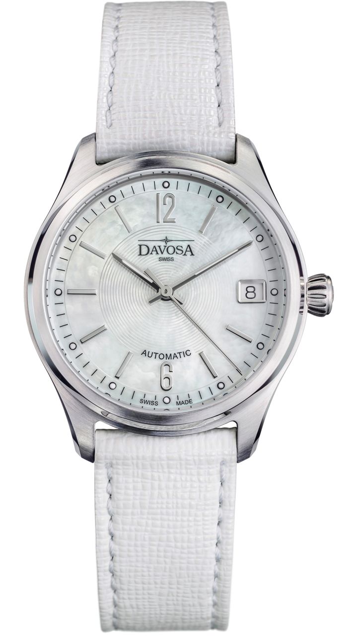 Elegantní dámské hodinky s perleťovým ciferníkem uprostřed gilošovaným. Ocelové pouzdro hodinek má průměr 34 mm, sklíčko je safírové. Na bodech u indexů a na ručičkách je SuperLuminova. Strojek DAV3022 je švýcarský s automatickým nátahem. Řemínek je z kůže Saffiano.