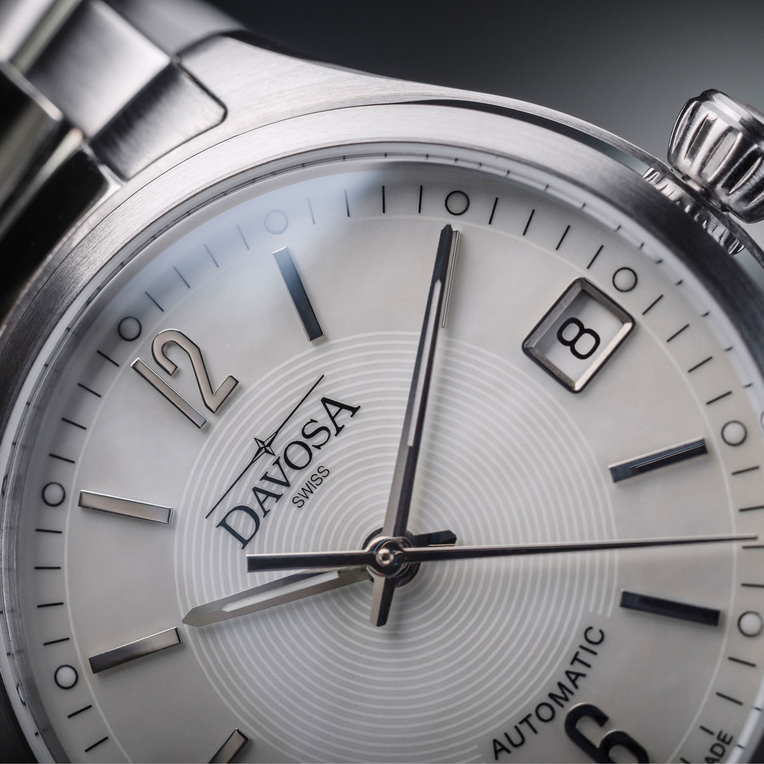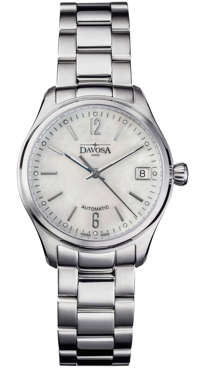 Elegantní dámské hodinky s perleťovým ciferníkem uprostřed gilošovaným. Ocelové pouzdro hodinek má průměr 34 mm, sklíčko je safírové. Na bodech u indexů a na ručičkách je SuperLuminova. Strojek DAV3022 je švýcarský s automatickým nátahem.