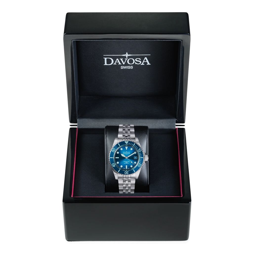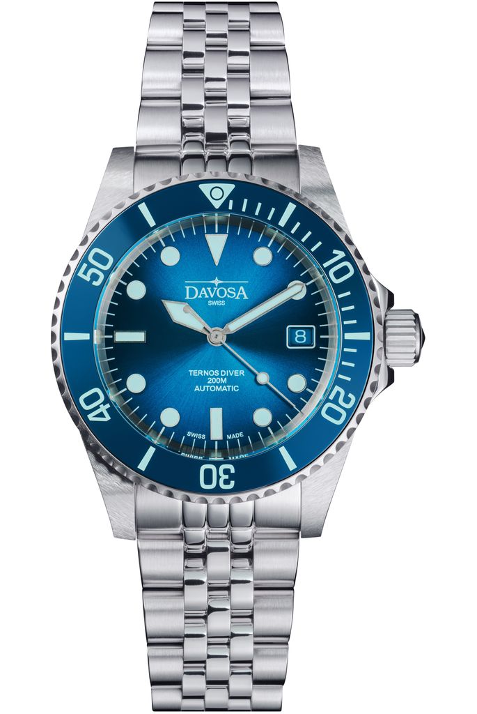 LIMITOVANÁ EDICE 200 ks modelu Ternos Diver Blue Lagoon kombinuje funkčnost s elegantním designem, který odráží jedinečnou hru světla pod vodou. Ciferník s jemným slunečním vzorem odráží barvy podmořského světa: střed má středně modrou barvu, která směrem k okrajům tmavne a vytváří optickou hloubku. Barevná vložka na lunetě je vyrobena z high-tech keramiky a je extrémně odolná proti poškrábání s tvrdostí (podle Vickers) 1250 HV. Je také odolná proti teplu a korozi a díky vysokému lesku je příjemná na dotek. Celá modrá high-tech keramická luneta, ručně nanesené indexové značky a ručičky jsou potaženy vrstvou Super-LumiNova® ve speciální světle modré barvě, díky čemuž jsou modré přechody na ciferníku viditelné i ve tmě.